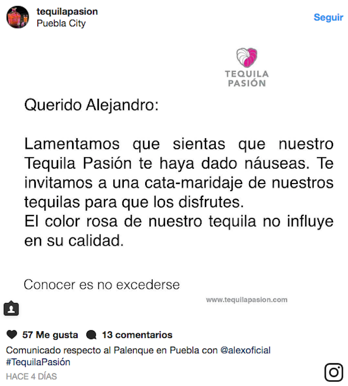 La marca, ante las quejas públicas de Fernández, le respondió en su perfil de Instagram, "Querido Alejandro: Lamentamos que sientas que nuestro Tequila Pasión te haya dado náuseas. Te invitamos a una cata-maridaje de nuestros tequilas para que los disfrutes. El color rosa de nuestro tequila no influye en su calidad. Conocer no es excederse".