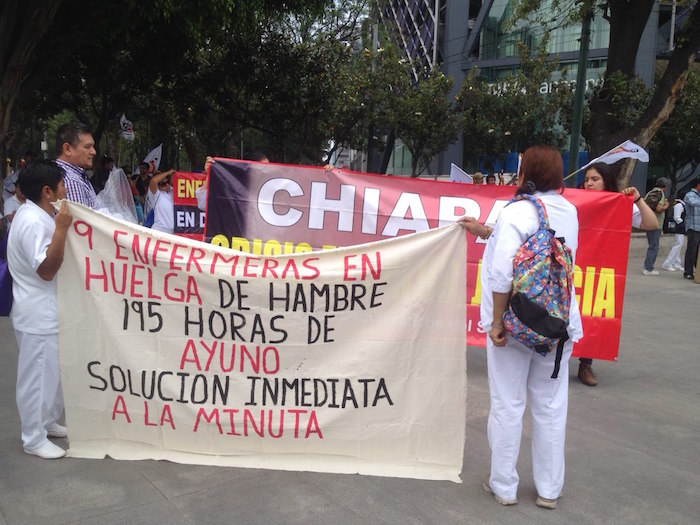 En el marco de las protestas en enero, febrero y marzo, 15 trabajadores del sistema de salud de Chiapas fueron despedidos. El 3 de abril, hace más de un mes, cinco enfermeras cesadas se instalaron en la entrada del Hospital de la Mujer "Rafael Pascacio Gamboa" en Tuxtla Gutiérrez y comenzaron una huelga de hambre. Demandaban su reinstalación, el pago de salarios y prestaciones atrasados, así como el abasto de medicinas.