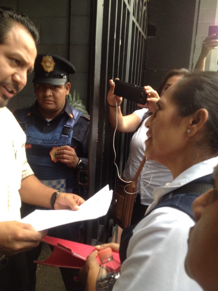 El jefe de Departamento de Servicios Laborales Alejandro Cejudo lo recibió a la entrada mientras los protestantes gritaban "la salud no es una mercancía, es un derecho humano que defiende enfermería".