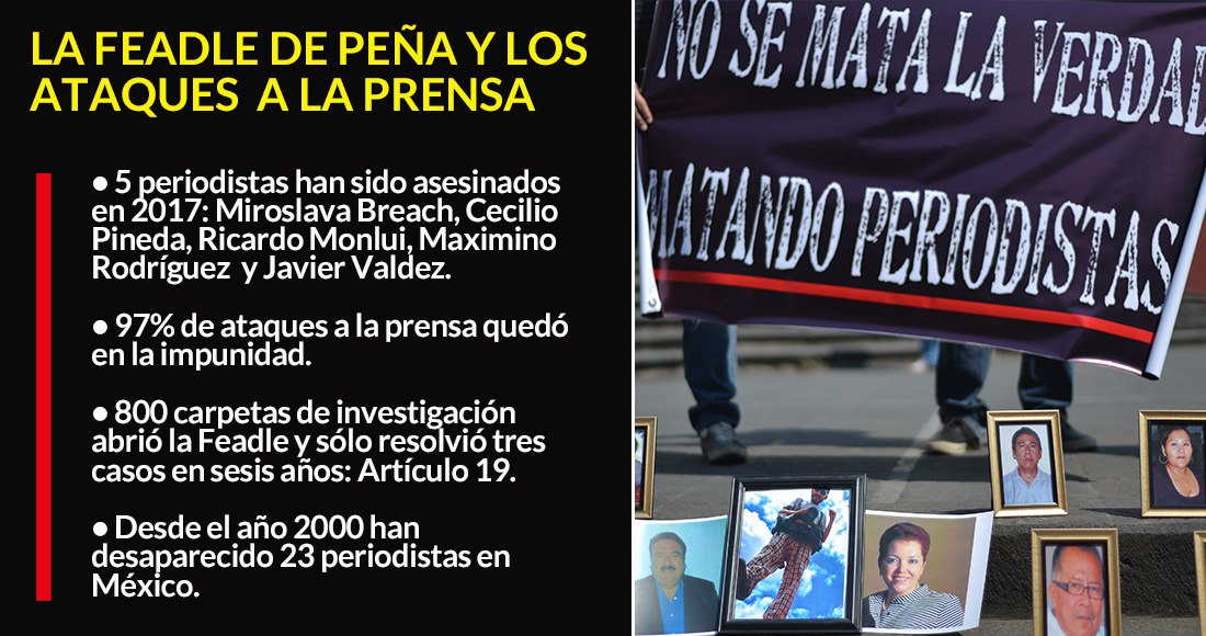 La FEADLE [Fiscalía Especializada para la Atención de Delitos cometidos contra la Libertad de Expresión] tiene un grado de 97 por ciento de ineficacia en la investigación y sentencia de los crímenes cometidos en contra de los informadores mexicanos, según sus propios datos.
