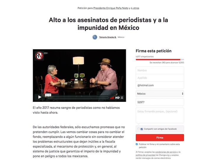 A través de la plataforma Change.org más de cuatro mil personas, 14 organizaciones defensores de la libertad de prensa y más de 20 comunicadores han firmado una petición para pedirle al gobierno del Presidente Enrique Peña Nieto detener las ejecuciones de periodistas en México.