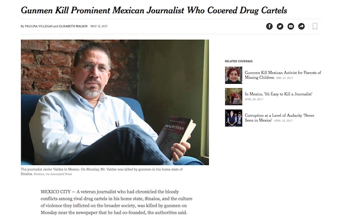 “La muerte del señor Valdez, que había compartido premios de la Universidad de Columbia y el Comité de Protección de Periodistas, eleva la presión sobre el gobierno del Presidente Enrique Peña Nieto para hacer frente a las ejecuciones con más fuerza”, puntualizó.