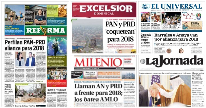 En el Reforma:Perfilan PAN-PRD alianza para 2018. Los líderes nacionales del Partido de Acción Nacional (PAN) y el Partido de la Revolución Democrática (PRD), Ricardo Anaya y Alejandra Barrales, plantearon ayer su intención de ir en alianza en las elecciones presidenciales de 2018.