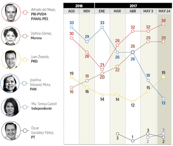 De acuerdo con el periódico El Financiero, en comparación con los resultados de su encuesta anterior, publicada el 3 de mayo, los candidatos preferidos se mantienen estables: del Mazo Maza sube dos puntos y Gómez Álvarez se mantiene en el mismo nivel.