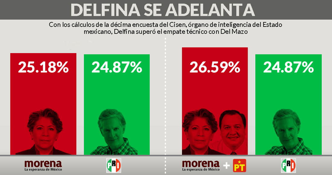 Ahora, con la suma del capital del PT, Morena queda en la delantera con 1.72 por ciento. A la candidatura de Delfina Gómez que tenía el 25.18 por ciento se añade el 1.40 por ciento del PT, lo que le da el 26.59 por ciento de las preferencias electorales. Alfredo del Mazo Maza tiene 24.87 por ciento.