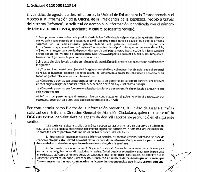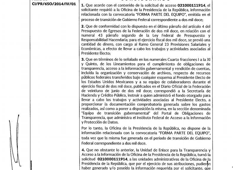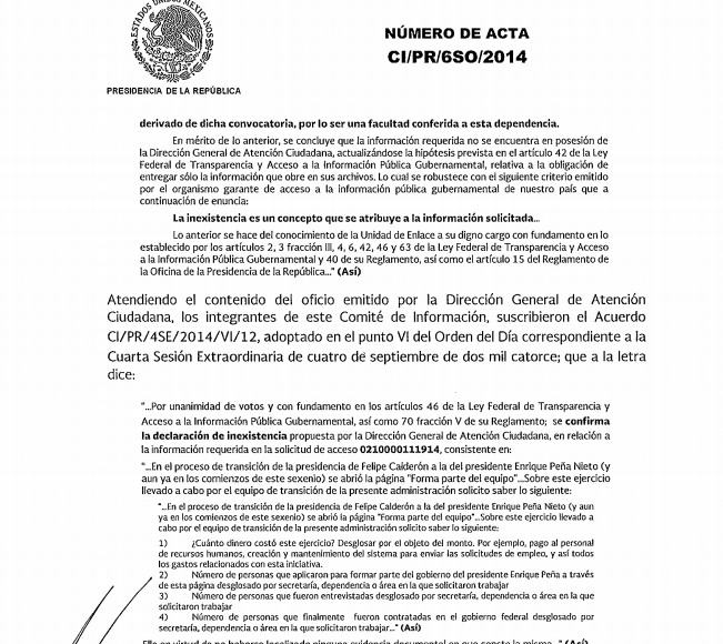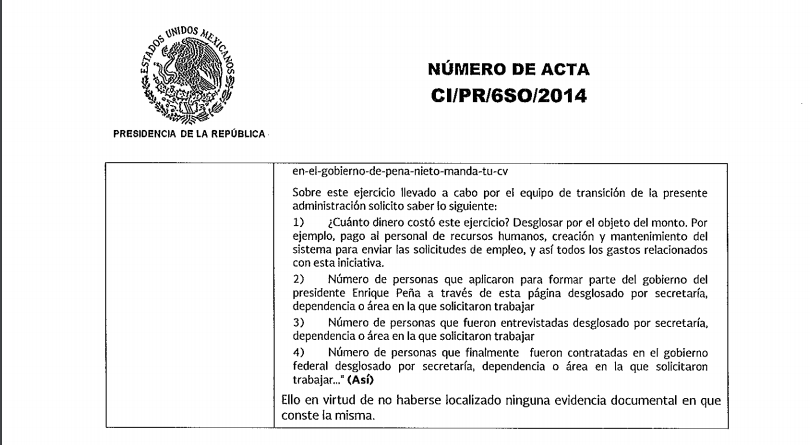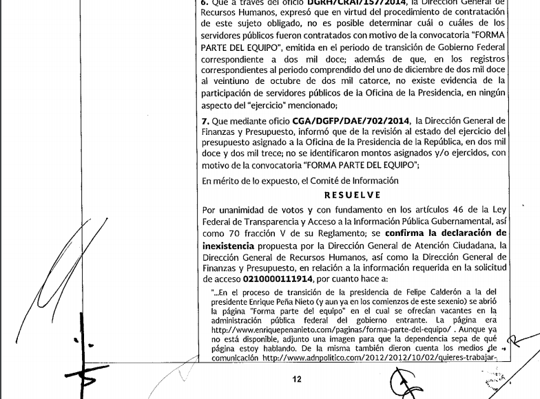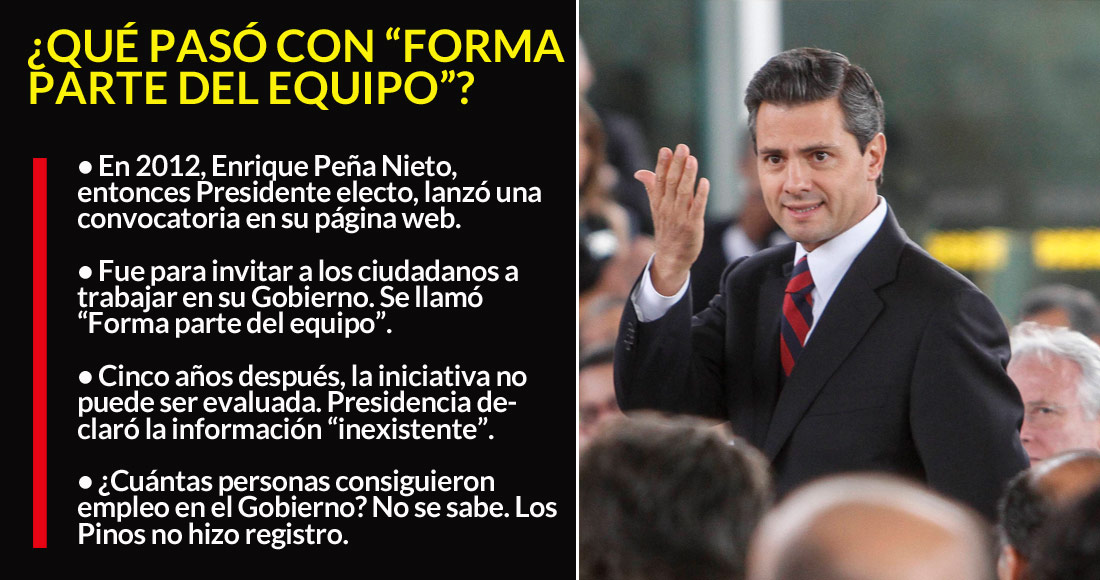 #DatosCerrados | Sin ningún rastro, la convocatoria “Forma parte del equipo” desapareció de la red. Fue lanzada en 2012 por el entonces Presidente electo, Enrique Peña Nieto en su página web para invitar a los ciudadanos a enviar el currículum vitae. ¿Cuántas personas lo hicieron? ¿Cuántas consiguieron empleo? Nada de ello puede conocerse porque la Presidencia de la República declaró “inexistentes” esos datos. Hoy, el Gobierno continúa con una gran bolsa de trabajo. Hay once mil vacantes con salarios que van desde los seis mil hasta los 200 mil pesos mensuales. Incluso hay posiciones para el extranjero, con más de seis mil dólares como ingreso bruto.