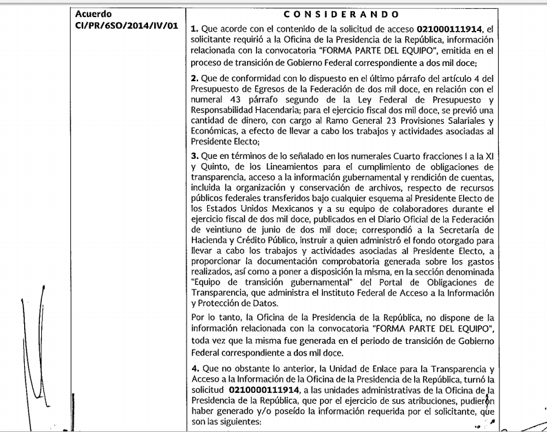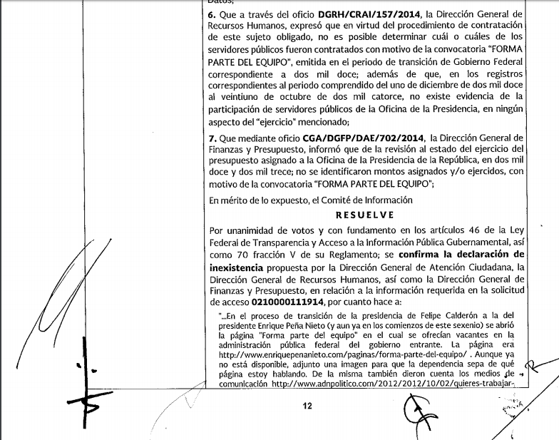 #DatosCerrados | Sin ningún rastro, la convocatoria “Forma parte del equipo” desapareció de la red. Fue lanzada en 2012 por el entonces Presidente electo, Enrique Peña Nieto en su página web para invitar a los ciudadanos a enviar el currículum vitae. ¿Cuántas personas lo hicieron? ¿Cuántas consiguieron empleo? Nada de ello puede conocerse porque la Presidencia de la República declaró “inexistentes” esos datos. Hoy, el Gobierno continúa con una gran bolsa de trabajo. Hay once mil vacantes con salarios que van desde los seis mil hasta los 200 mil pesos mensuales. Incluso hay posiciones para el extranjero, con más de seis mil dólares como ingreso bruto.