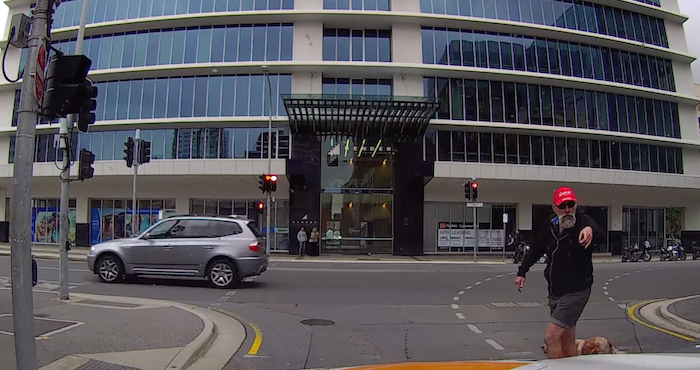 La escena sucede en Adelaide, Australia. Un conductor que llevaba una cámara instalada en su coche se detiene en un paso de peatones. Un transeúnte con su perro comienza a cruzar haciendo aspavientos hacia el conductor al considerar que iba demasiado rápido antes de frenar. En ese momento ocurre la magia.
