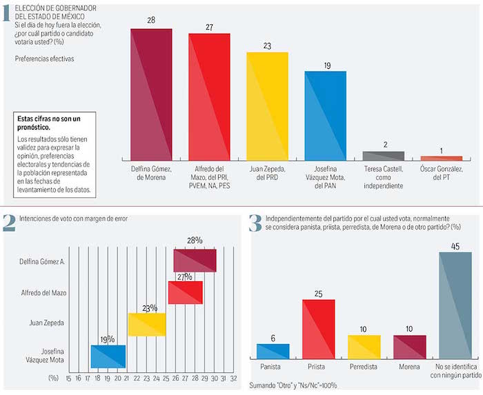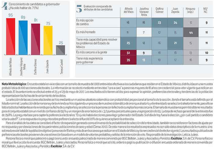 El sondeo realizado del 25 al 29 de mayo, registra que Gómez (28 por ciento) aventaja un punto sobre Del Mazo (27 por ciento). Les sigue el candidato del Partido de la Revolución Democrática (PRD), Juan Zepeda Hernández (23 por ciento) y en cuarto lugar se posiciona la abanderada del Partido Acción Nacional (PAN), Josefina Vázquez Mota con 19 por ciento.