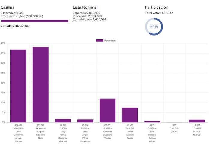 Con el 100 por ciento de las casillas computadas, el PREP del Instituto Electoral de Coahuila (IEC) dio el triunfo al candidato priista Miguel Riquelme Solís, con 38.3145 por ciento de los votos. La participación, sin embargo, fue más baja: 881 mil 342 votos, lo que representa el 60 por ciento del total.