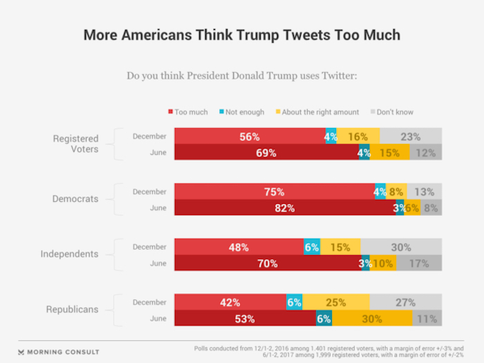 Segmentando por tipo de votantes, el 82 por ciento de los demócratas encuestados criticó la actividad de Trump en Twitter, mientras que una mayoría absoluta de republicanos (53 por ciento) también están en desacuerdo con su líder. Se trata, en este último caso, de un 11 por ciento más que en diciembre.
