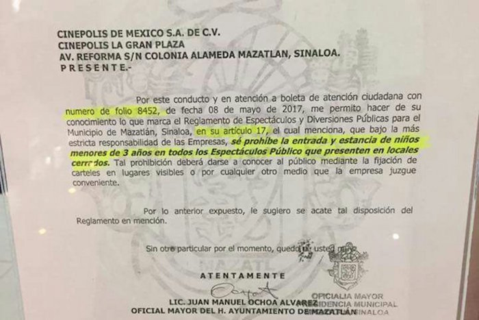 Esto tras una imagen que circuló en redes sociales en el que por medio de un oficio, Oficialía Mayor en base al artículo 17 de dicha ley prohíbe la entrada y estancia de niños menores de tres años en todos los espectáculos públicos que presenten en la localidad.