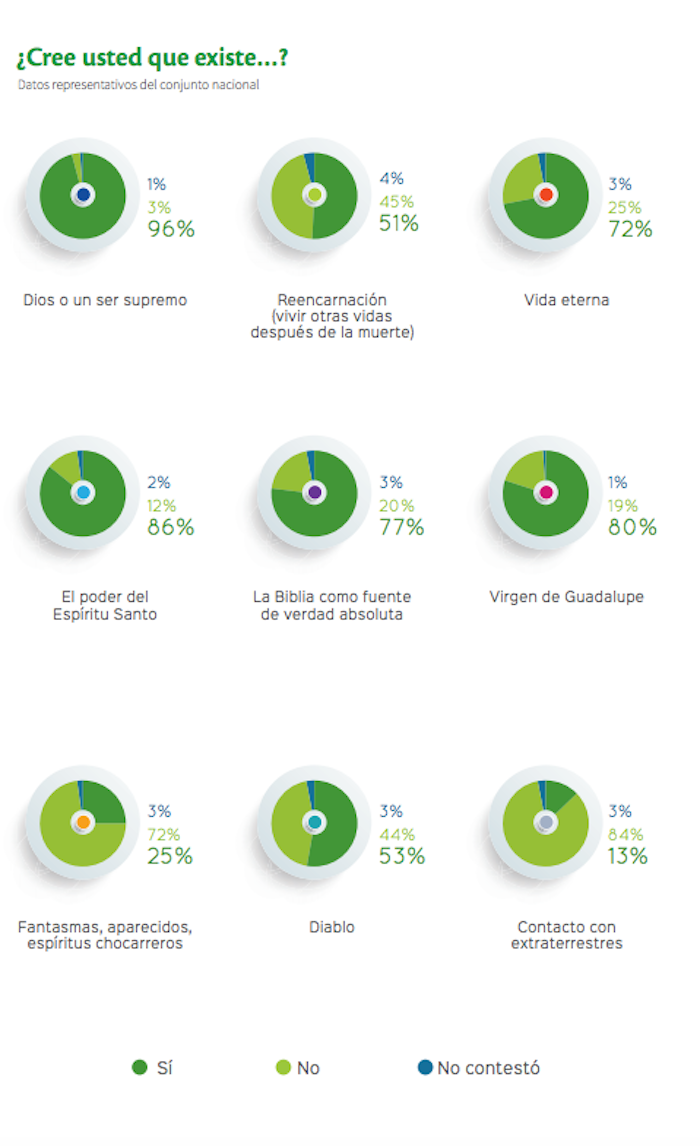 El 96 por ciento de los entrevistados declaró creer en un dios, el 3 por ciento dijo que no creía en su existencia y el 1 por ciento prefirió no contestar. En la vida eterna cree uno de cada siete entrevistados; uno de cada ocho, en la Virgen de Guadalupe y en la Biblia como fuente de verdad absoluta, y en la existencia del Diablo y la reencarnación cree la mitad de ellos.