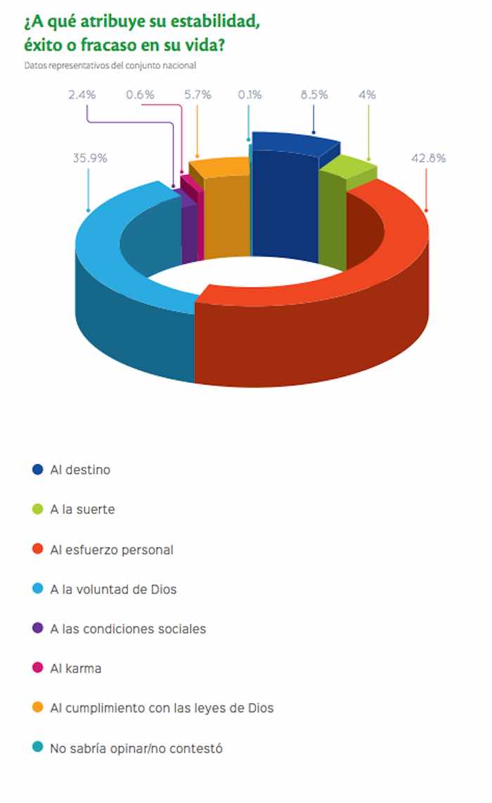 Ante la pregunta "¿A qué atribuye su estabilidad, éxito o fracaso en su vida?", la mayoría contesto que al esfuerzo personal (42.8 por ciento), a la voluntad de dios (35.9 por ciento), y al destino (8.5 por ciento).