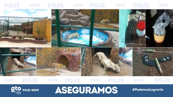 Ciudad de México, 15 de junio (SinEmbargo/ZonaFranca).- En seguimiento a una investigación criminal, agentes especializados de la Procuraduría General de Justicia del Estado (PGJE), con apoyo del Grupo de Coordinación Guanajuato, aseguraron 3 tigres de bengala, un pavo real blanco, gallinas japonesas, dinero en efectivo, cartuchos y droga en dos inmuebles ubicados en el camino viejo a San Antonio, en el municipio de Jerécuaro.