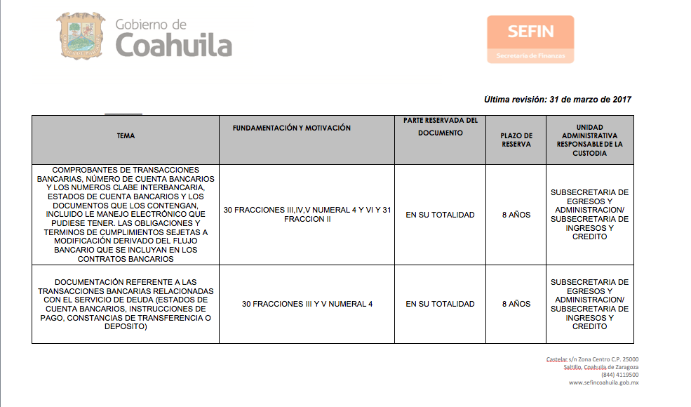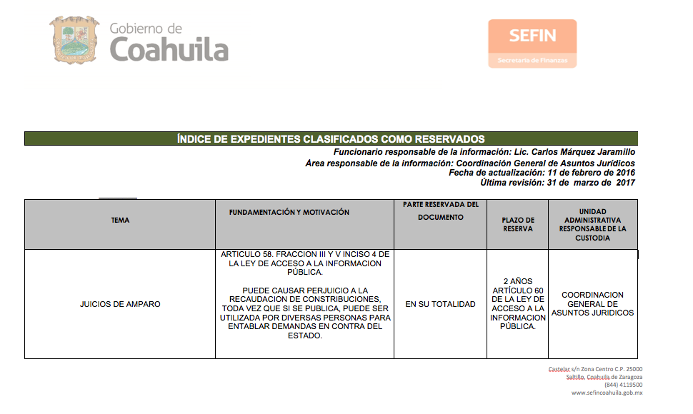 Si se toma en cuenta ese monto, cada coahuilense –incluso los menores de edad - debe 12 mil 527 pesos, según un cálculo de Aregional. Pero el habitante del estado norteño no sabe a quién le debe. Los nombres de los acreedores –personas o empresas- las transacciones bancarias, así como toda la información de carácter económico, contable y jurídico de quienes prestaron dinero no puede conocerse porque está bajo las llaves del Índice de Expedientes Reservados de la Secretaría de Finanzas (Sefin) del Gobierno de Coahuila.