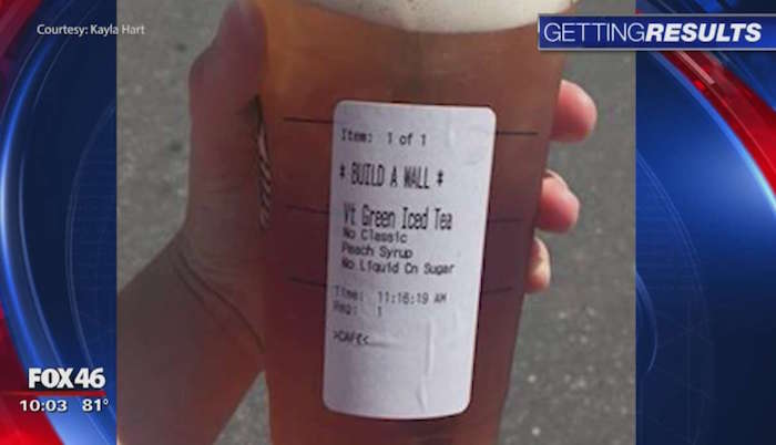 En esta ocasión, una mujer mostró su vaso en el que el se escribió “Construye un muro” en su té verde helado.