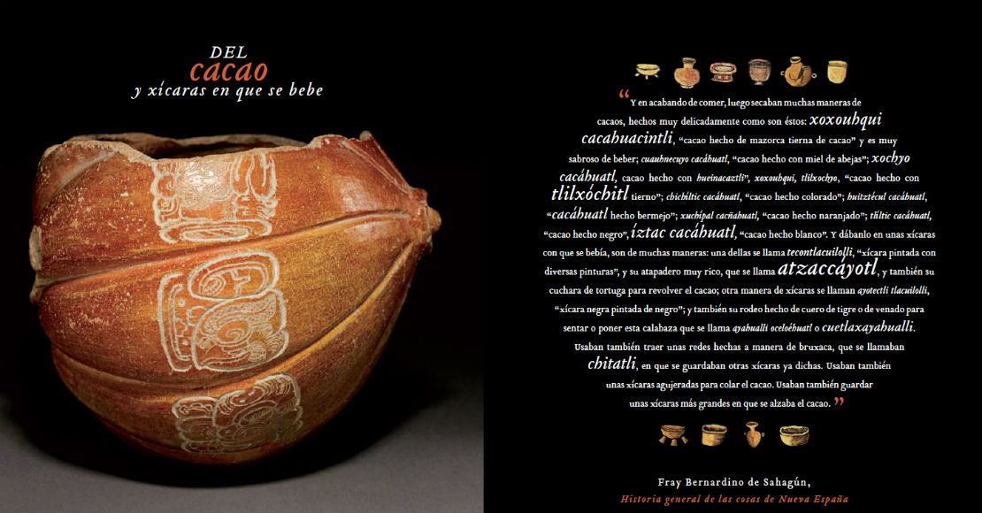 “En la Historia general de las cosas de la Nueva España fray Bernardino de Sahagún cita una de las metáforas más sorprendentes e interesantes sobre las restricciones sociales de la alimentación en el universo nahua. Menciona que el cacao solamente lo bebían los nobles y acaudalados y lo llamaba yollotli eztli que quiere decir “precio de sangre y de corazón” (Chocolate III, Ritual, arte y memoria, número 110).