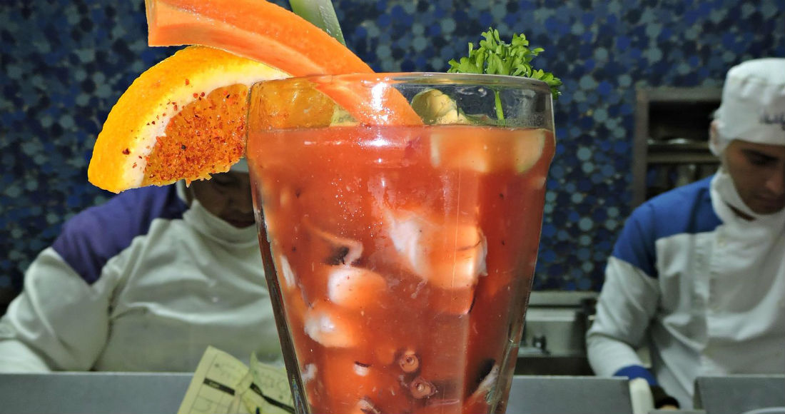 –Una bebida con Clamato, mariscos, hielo, sal, pimienta, salsa inglesa, salsa Tabasco, salsa negra ―secreto de la casa―, gotas de limón y chile en polvo en un vaso escarchado con sal. Además, una rama de apio y una banderilla de tamarindo con chile; ¡ah, se me olvidaba!, y un saladito ―ciruela deshidratada en sal, limón y agua―, ese le da un toque especial.