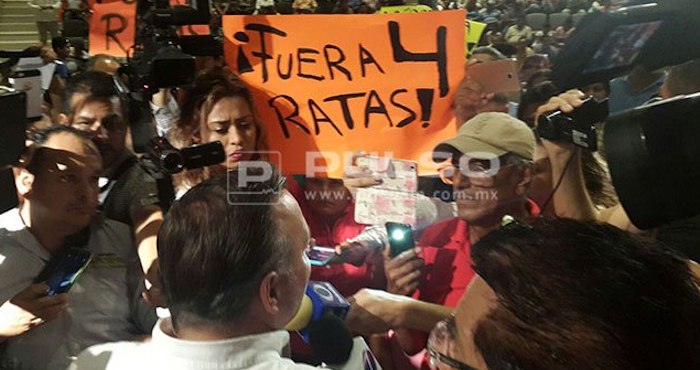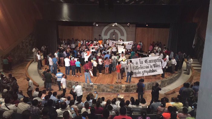 Con pancartas en las que se reprocha la corrupción que presuntamente impera en el Congreso, los inconformes tomaron la tribuna en el recinto habilitado para la sesión y con gritos de “Fuera, fuera” impidieron a los legisladores continuar con el orden del día.