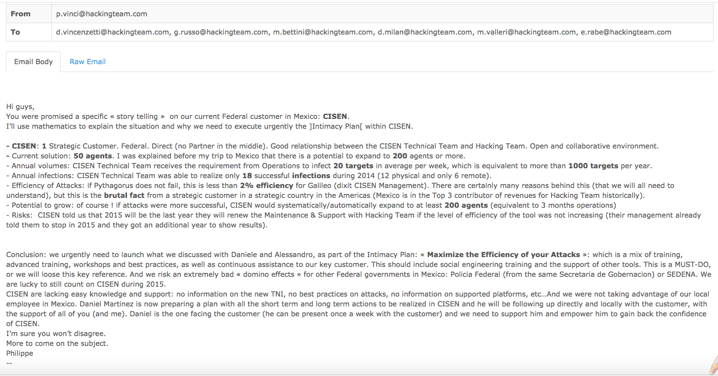 Un mensaje enviado por Sergio Rodríguez-Solís, ingeniero de la firma italiana, quien reportó que en una visita hecha al CISEN el 15 de enero de 2014, consignó: “ellos explicaron que habían probado por sí mismos un sistema de infección ‘manos libres’ para teléfonos móviles que funcionaba en hasta 80 por ciento de los dispositivos que probaron, incluyendo Android, BB [BlackBerry], iOS y Symbian. Se quejaron de por qué nosotros no tenemos vectores de infección que no requieren de la interacción del usuario como NSO tiene”.