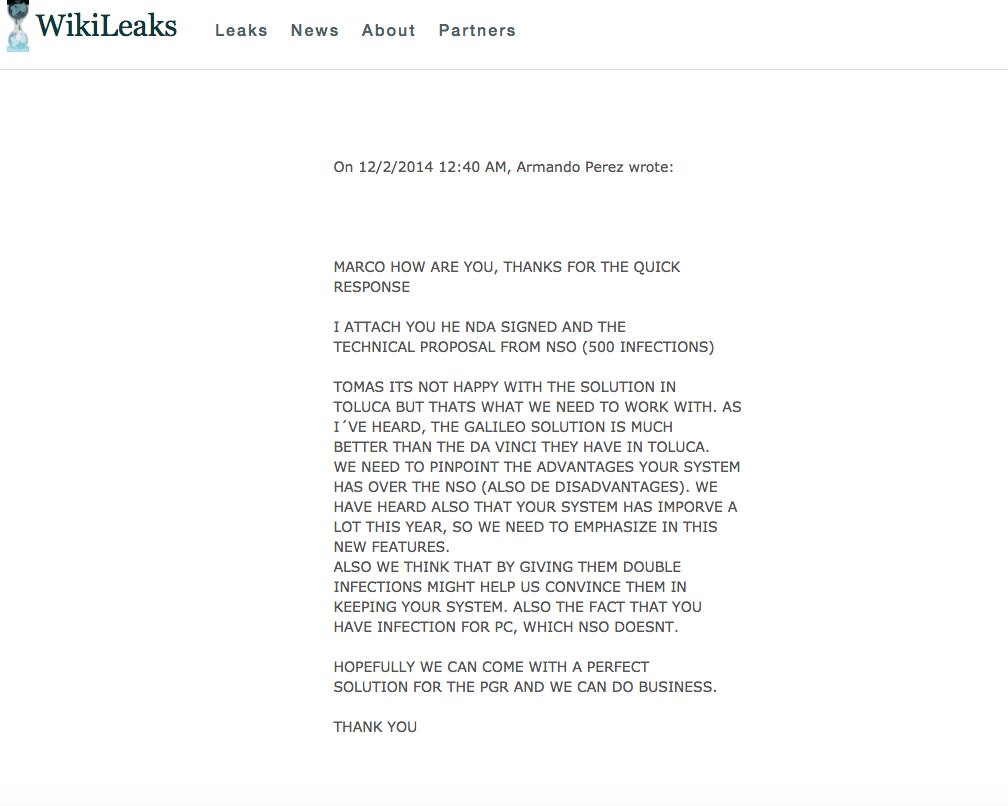 Lo siguiente se desprende de los correos electrónicos filtrados por Wikileaks en 2015 de la empresa italiana The Hacking Team, competidora de NSO Group. En un cable puede leerse que Tomás Zerón se quejó de Da Vinci –otro producto de The Hacking Team - en el Gobierno del Estado de México y que había dicho que no lo deseaba en la Procuraduría General de la República. En uno más, se revela que funcionarios del CISEN preguntaron por qué The Hacking Team no contaba con vectores de infección que no requerían ser instalados físicamente en los dispositivos, como sí los tenía NSO Group.