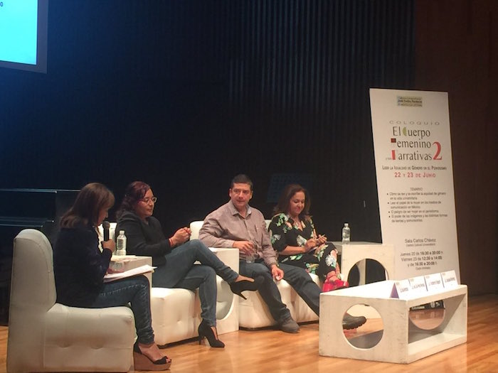 Acompañada de Ana Lilia Pérez y Humberto Padgett, los tres reporteros hablaron de la situación que viven las periodistas en los medios de comunicación en México. Ello en el marco del coloquio "El cuerpo femenino y sus narrativas", organizado por la Universidad Nacional Autónoma de México (UNAM).