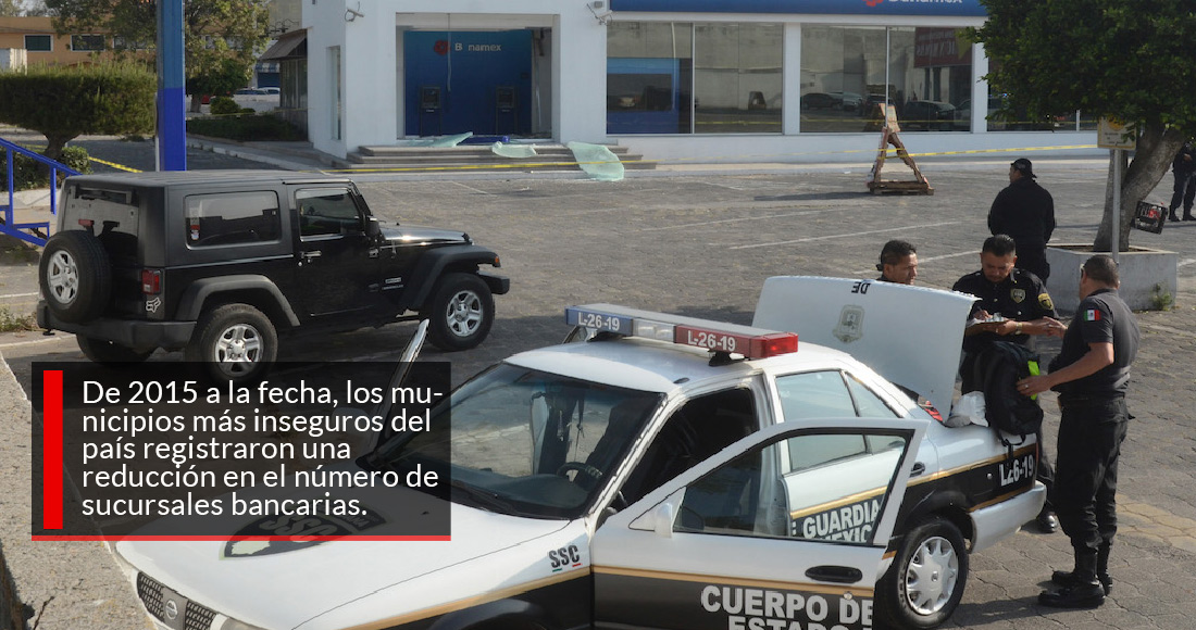 La inseguridad ha vuelto a colocarse como un foco de preocupación para el crecimiento económico del país, incluso en las más recientes encuestas del Banco de México ha escalado al primer lugar entre otros factores que pueden restar dinamismo a la actividad nacional. De 2015 a la fecha, los municipios más inseguros del país registran una reducción en el número de sucursales bancarias que operan en sus territorios.