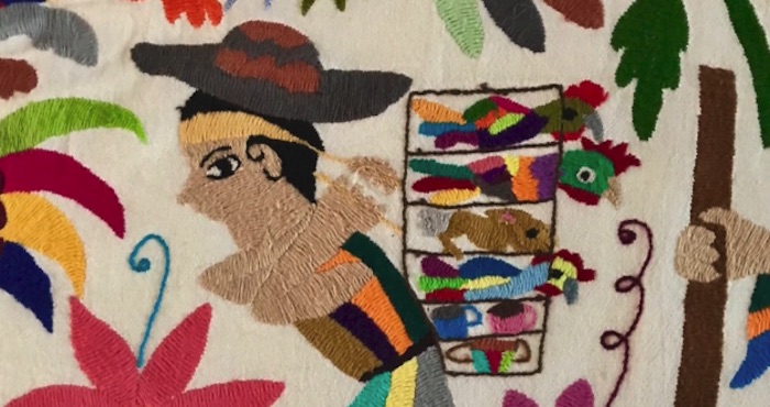 El arte bordado de Los Tenangos, en Hidalgo, es maravillosamente narrativo y lleno de imaginación. Cuenta por adelantado lo que al verlo bordado recordaremos. Esta obra es de Ezequiel Vicente.