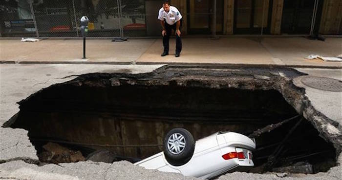 Un auto cayó en un enorme bache en St. Louis, EU, cuando sus dueños estaban en el gimnasio. No hay reporte de heridos.