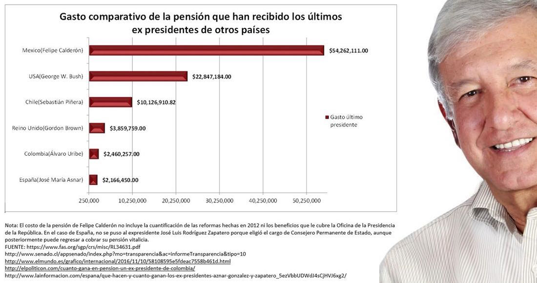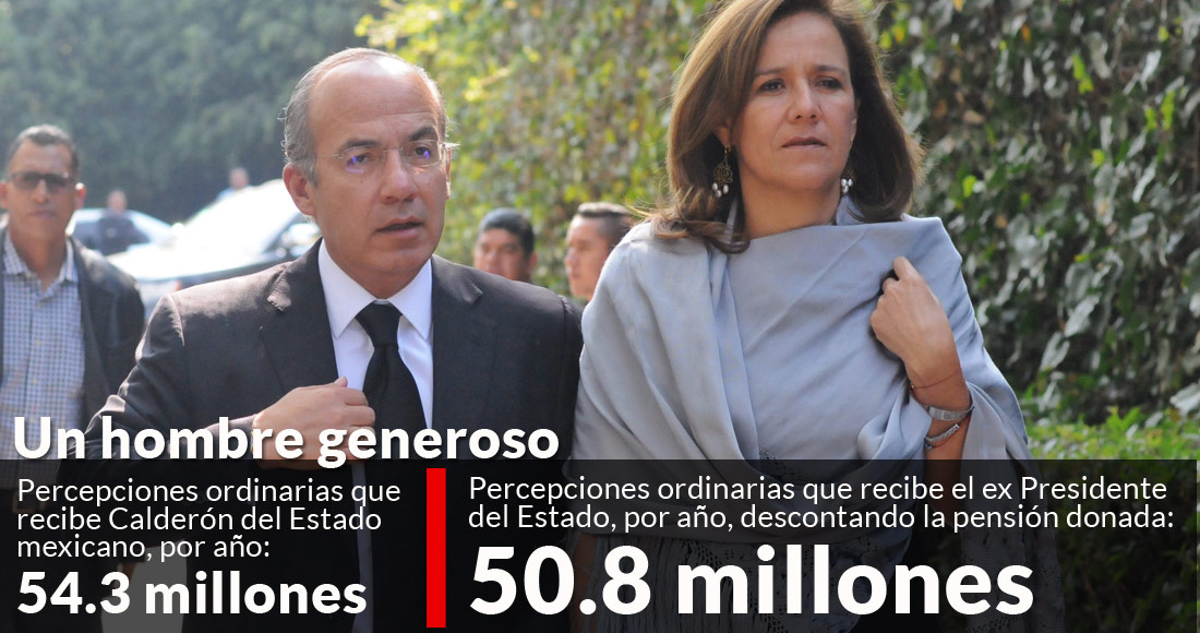 Ambos ex Mandatarios gozan de una pensión vitalicia otorgada por la Presidencia de la República. Vicente Fox la ha cobrado desde 2007 a julio de 2017, unos 40 millones 590 mil pesos si se considera que por ese concepto se paga lo mismo que a un Secretario de Estado (en este momento es de 205 mil 122 pesos, hace unos años fue de 200 mil) y Felipe Calderón Hinojosa ha devengado, 11 millones 70 mil pesos.