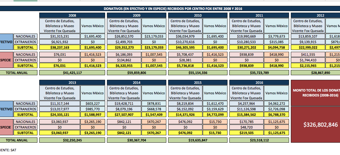 Para calcular la recepción de dinero de las fundaciones de los ex Presidentes, esta Unidad de Datos no consideró 2007 porque el documento respectivo ya no se encuentra en el archivo de la SHCP. Sin tomarlo en cuenta, el matrimonio Fox-Sahagún ha ganado hasta ahora 326 millones 803 mil 206 pesos. Pero la cifra que reconoce la pareja es mayor. El 21 de mayo de 2017, ante cientos de jóvenes, el ex Presidente afirmó que él y su cónyuge han recibido más de 500 millones de pesos.
