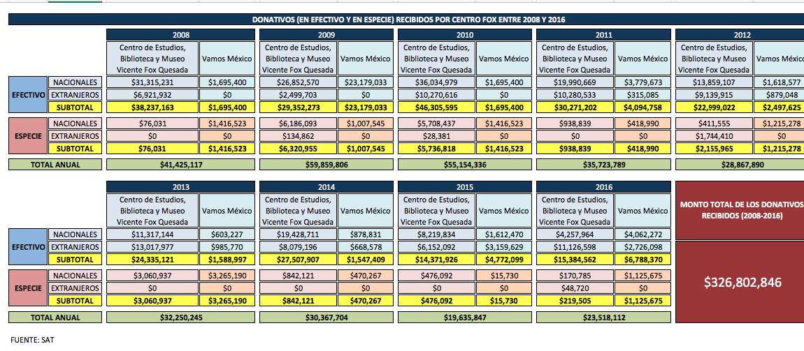 Para calcular la recepción de dinero de las fundaciones de los ex Presidentes, esta Unidad de Datos no consideró 2007 porque el documento respectivo ya no se encuentra en el archivo de la SHCP. Sin tomarlo en cuenta, el matrimonio Fox-Sahagún ha ganado hasta ahora 326 millones 803 mil 206 pesos. Pero la cifra que reconoce la pareja es mayor. El 21 de mayo de 2017, ante cientos de jóvenes, el ex Presidente afirmó que él y su cónyuge han recibido más de 500 millones de pesos.