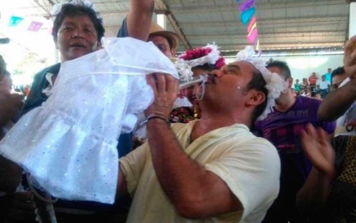 Espinosa señaló que los "mareños", como llaman en Huamelula a los huaves, le buscan al lagarto una madrina, que se encarga de confeccionarle su ropa típica de la región, e incluso lo llevan a la Iglesia de San Pedro Apóstol, donde los sabios del lugar bautizan al animal con el nombre de la esposa del Alcalde en turno.