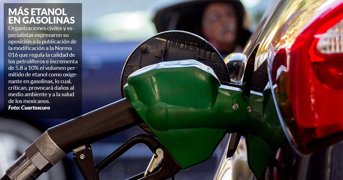 Ante este panorama, organizaciones de la sociedad civil y expertos enviaron una misiva a la CRE, con copia al Presidente de la República, a Rafael Pacchiano Alamán, titular de la Secretaría de Medio Ambiente y Recursos Naturales (Semarnat), y al Secretario de Energía, Pedro Joaquín Coldwell, donde expresan su desacuerdo por las modificaciones a la norma que incrementa de 5.8 a 10 por ciento el volumen permitido de etanol como oxigenante en el combustible.