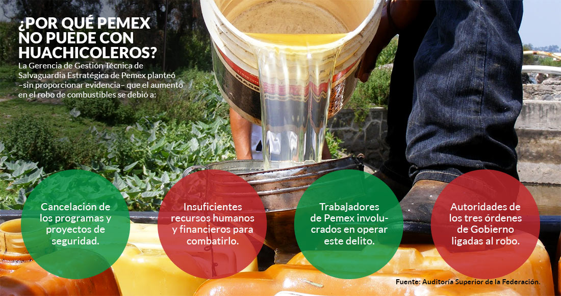 “La Gerencia de Gestión Técnica de Salvaguardia Estratégica, adscrita a la Subdirección de Salvaguardia Estratégica de Pemex Corporativo, señaló, sin proporcionar la evidencia, que esto (el aumento) se debió a que se cancelaron programas y proyectos de seguridad por falta de ajustes presupuestales; los recursos humanos, materiales y financieros para combatir estratégica y frontalmente el robo de combustibles fueron insuficientes; y se presume la existencia de algunos trabajadores de Pemex y autoridades de los tres órdenes de Gobierno que participan en el mercado ilícito de combustibles, lo que genera pérdidas y pone en riesgo a las instalaciones productivas, a la población y al medio ambiente”, reporta la ASF.