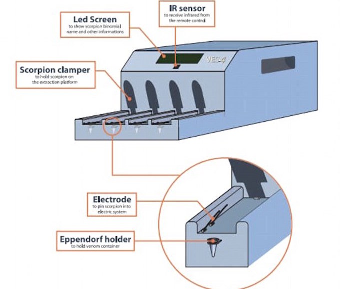 El sistema funciona así: se coloca al escorpión en uno de los espacios que tiene el robot para ello, se le sujeta la cola para que no se mueva y se le estimula de manera eléctrica para que suelte las gotas de veneno en un depósito.