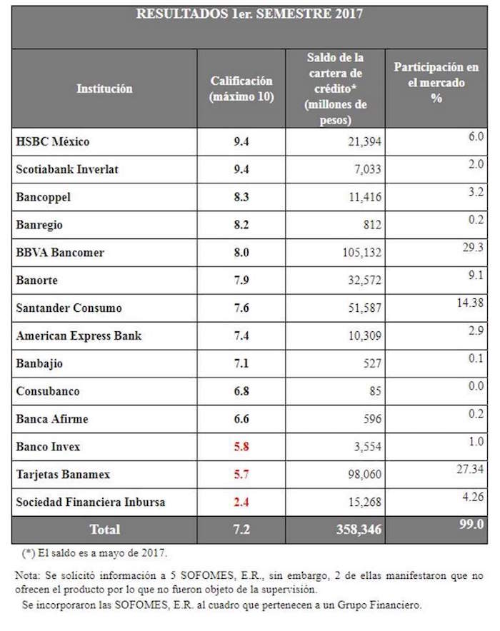 Los bancos con calificación reprobatoria en la escala de 0 a 10 fueron: Sociedad Financiera Inbursa, Banco Invex y Tarjetas Banamex. Citibanamex tiene la segunda cartera más grande con 98,060 millones de pesos y además es el segundo mayor participante en el mercado con 27.34 por ciento, sólo por debajo de Bancomer.