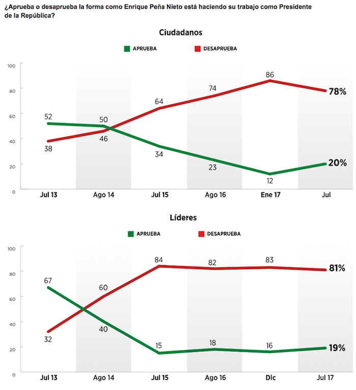 Ciudad de México, 20 de julio (SinEmbargo).- En una encuesta realizada y difundida hoy por el Grupo Reforma, el trabajo del Presidente Enrique Peña Nieto es evaluado por los ciudadanos y líderes con una ligera mejora.
