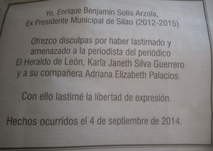 Yo, Enrique Benjamín Solís Arzola, ex Presidente Municipal de Silao (2012-2015) ofrezco disculpas por haber lastimado y amenazado a la periodista del periódico El Heraldo de León, Karla Janeth Silva Guerrero y a su compañera Adriana Elizabeth Palacios.