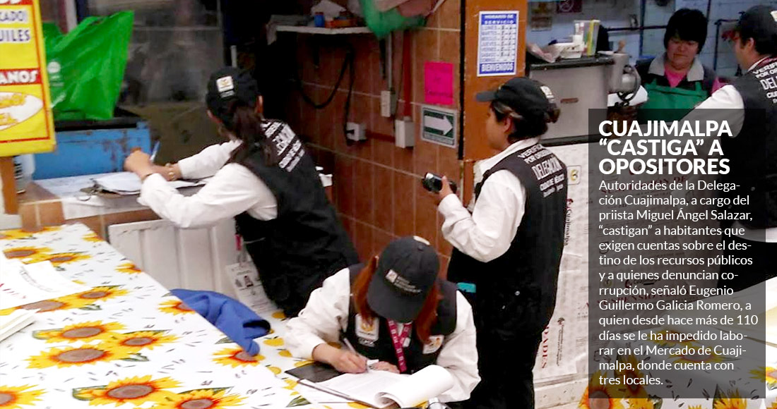Eugenio Galicia Romero, locatario del Mercado Cuajimalpa, ubicado en el centro de esa demarcación, acusa al Delegado priista Miguel Ángel Salazar de "castigarlo" con cerrar ilegalmente los locales de él y de su familia, debido a que desde hace años apoya la protesta social en esa demarcación: desde la oposición al Tren México-Toluca, hasta las irregularidades en los permisos de uso de suelo para construir grandes edificios, la exigencia de cuentas claras a las autoridades en la administración de recursos público o el uso del agua potable para proyectos que desplazan a la población.