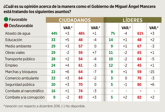 De acuerdo con la consulta telefónica realizada del 20 al 25 de julio a 800 capitalinos adultos de las 16 delegaciones y a 350 líderes de opinión provenientes de la política, academia, iniciativa privada y sociedad civil, a través de correos electrónicos enviados del 12 al 17 del mismo mes, el 64 por ciento de los ciudadanos y el 71 por ciento de los especialistas no están de acuerdo con el trabajo que realiza el perredista.