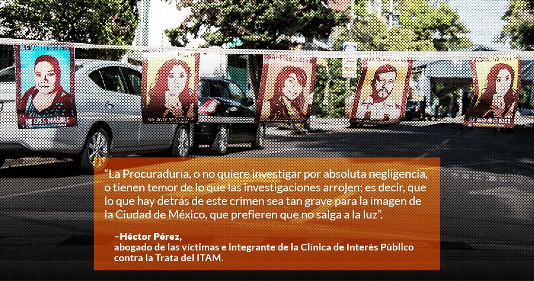 “La Procuraduría [General de Justicia de la CdMx], o no quiere investigar por absoluta negligencia, o tienen temor de lo que las investigaciones arrojen; es decir, que lo que hay detrás de este crimen sea tan grave para la imagen de la Ciudad de México, que prefieren que no salga a la luz”, consideró el abogado de las víctimas Héctor Pérez, quien es también integrante Clínica de Interés Público contra la Trata del Instituto Tecnológico Autónomo de México.