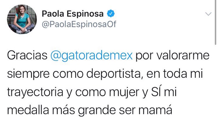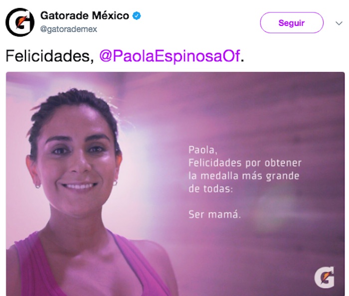 La marca de bebidas Gatorade felicitó recientemente a la deportista Paola Espinosa “por obtener la medalla más grande de todas”. La medalla en cuestión: “ser mamá”. Espinosa, una atleta mexicana consumada, no sólo no se sintió ofendida, sino que respondió a esta felicitación mediante un mensaje que cerró con la frase “SÍ mi medalla más grande ser mamá” (sic). La felicitación de Gatorade a Paola Espinosa es sexista, y la respuesta de Paola Espinosa a Gatorade, también. En este artículo argumentaré que se equivocan quienes afirman lo contrario.