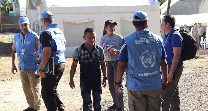 La Misión de la ONU en Colombia tiene carácter político y no militar, por lo que los policías y militares internacionales que la integran van desarmados aunque claramente identificados con chalecos azules con el emblema del organismo.
