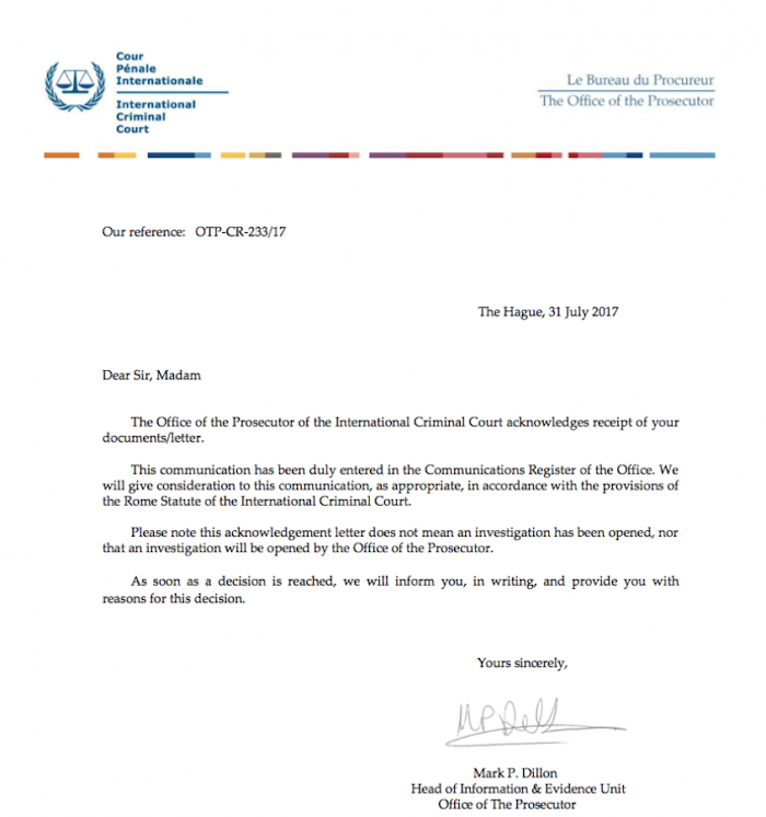 El documento oficial está firmado por Mark P. Dillon titular de la Unidad de Información y Evidencia del organismo internacional.