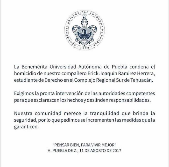 Asimismo la BUAP emitió un comunicado condenando los hechos y exigió esclarecer el asesinato de Erick Joaquín Ramírez Herrera.