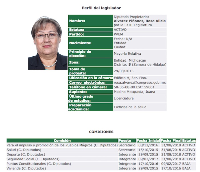 Ciudad de México, 12 de agosto (SinEmbargo).- Rosa Alicia Álvarez Piñones, Diputada Federal por el distrito 5 de Zamora de Hidalgo, Michoacán, del Partido Verde Ecologista de México (PVEM), no ha hecho públicas sus posesiones ni en la declaración patrimonial que debió presentar al Congreso de la Unión ni en la plataforma 3de3, iniciativa en la que, desde su campaña en 2015, se negó a incluirse con un rotundo “no” y la frase “presionando de esa manera no se pueden hacer las cosas”.