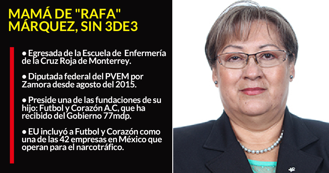 En la plataforma 3de3 no hay nada bajo el nombre de la Diputada del PVEM por Zamora, Rosa Alicia Álvarez, progenitora de la joya del futbol nacional, "Rafa" Márquez, quien enfrenta acusaciones de lavado de dinero por parte del Gobierno de EU.