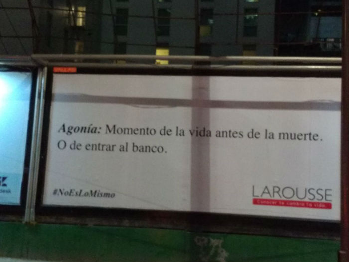 Ciudad de México, 19 de agosto (SinEmbargo).-Desde hace un año, la casa editorial Larousse utiliza en redes sociales y como parte de su campaña en exteriores, la etiqueta #NoEsLoMismo para mostrar que el lenguaje está vivo y es de todos. Las campañas de Larousse se han caracterizado por utilizar definiciones o juegos de palabras ad hoc con los sitios en que son colocadas y al público que interactúa con ellas.